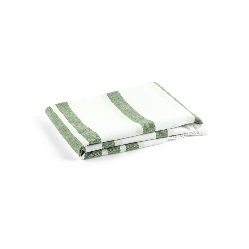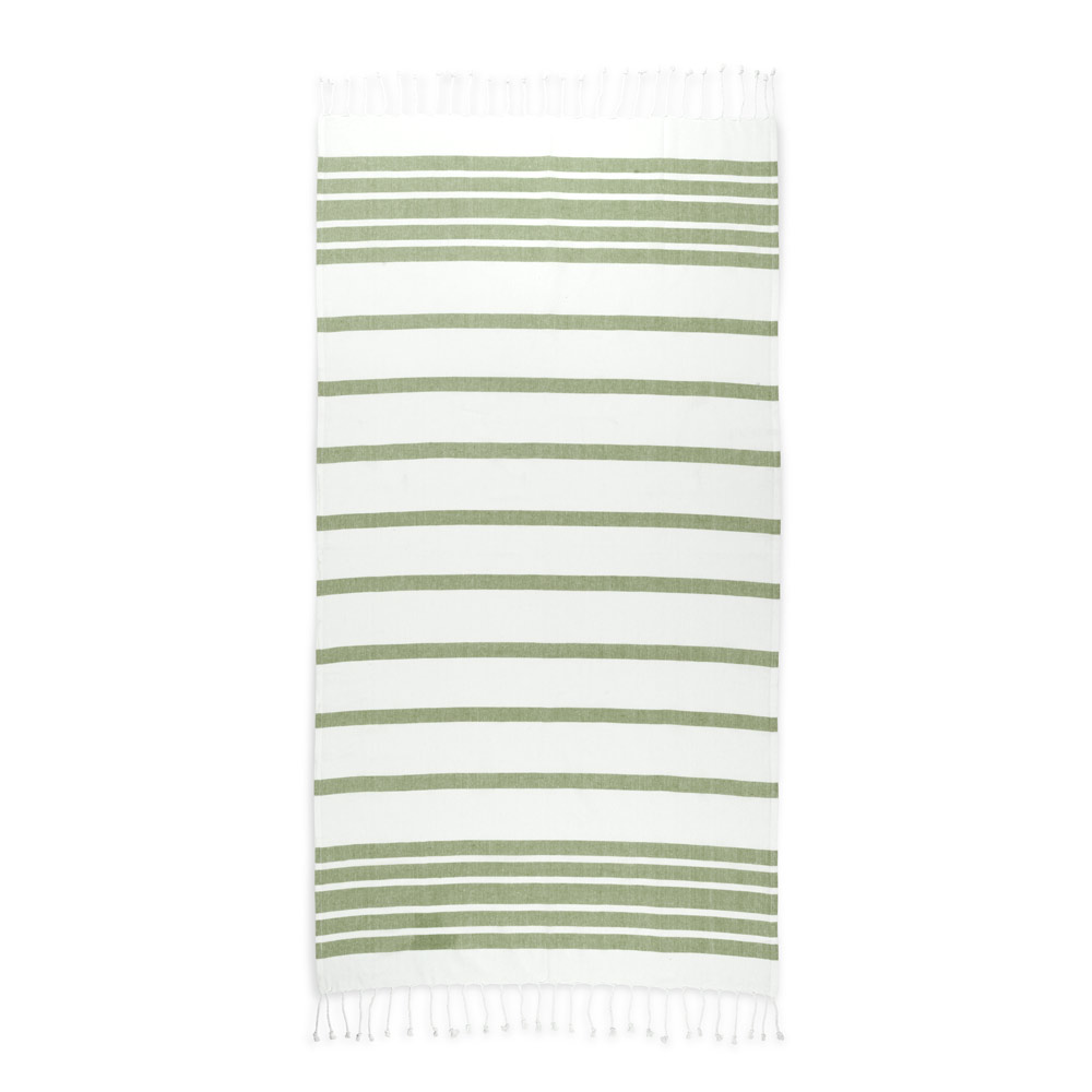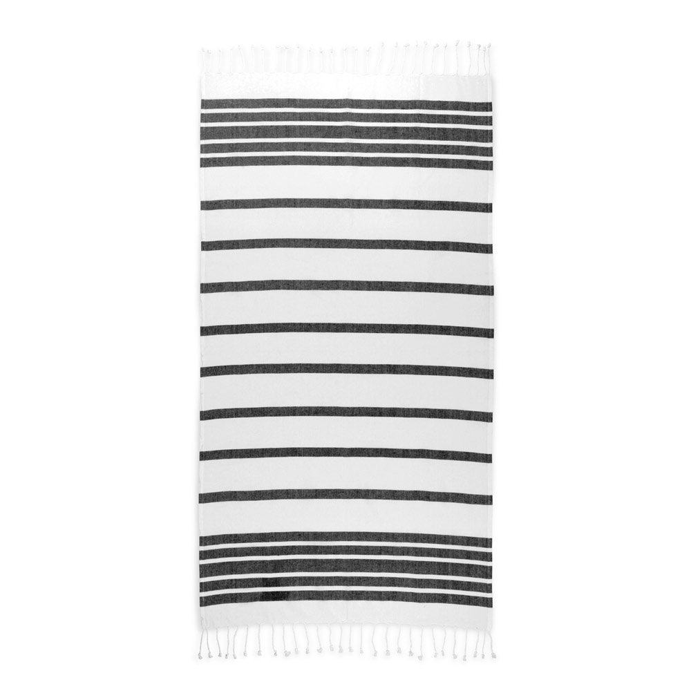 Toalha de praia em algodão 70% reciclado e poliéster 30% reciclado (180 g/m²), com um design minimalista e elegante para os seus dias de praia