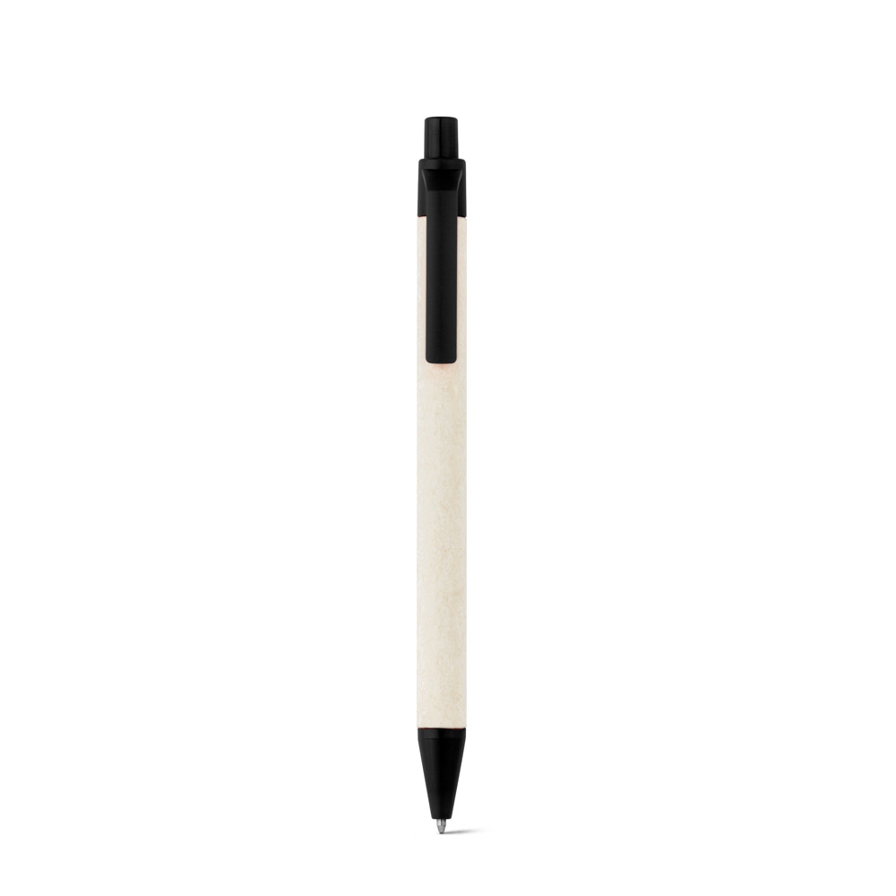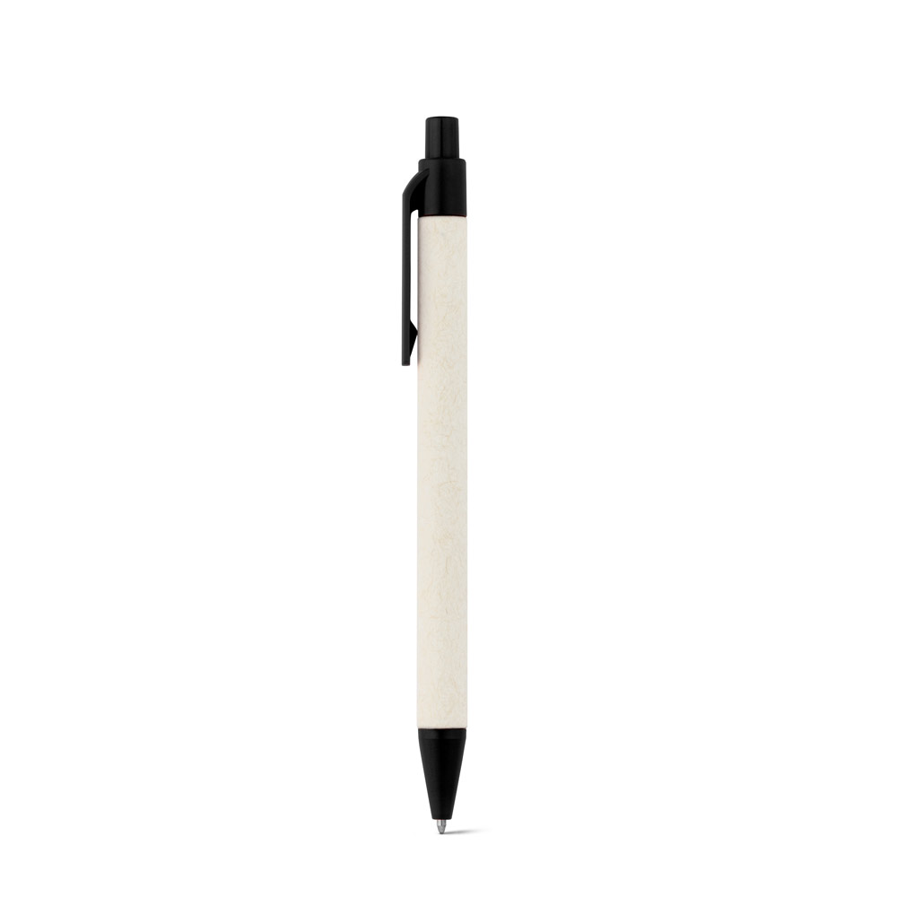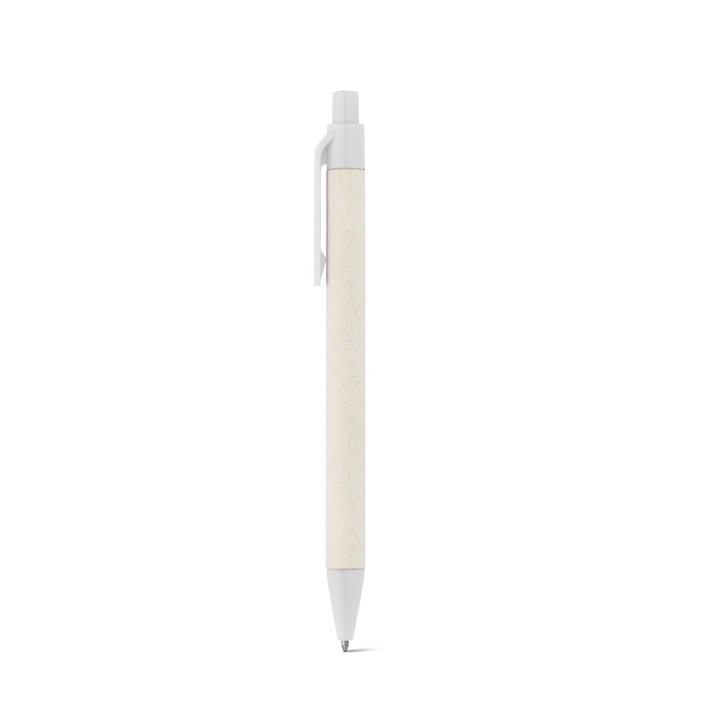 Esferográfica produzida através de pacotes de leite reciclados, contribuindo para o reaproveitamento do cartão e alumínio. Corpo em cartão e componentes coloridos em ABS 100% reciclado. Escrita em azul até 1,5 km