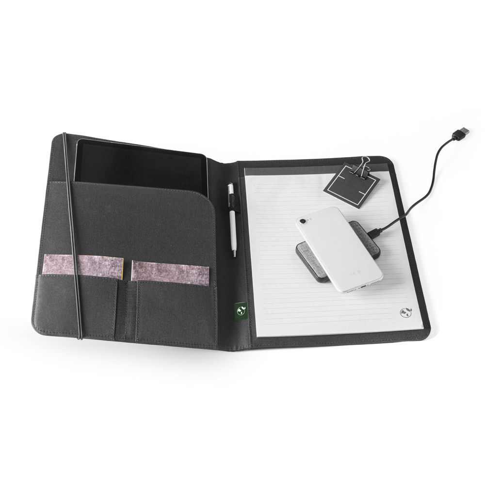 Pasta A4 em poliéster 100% reciclado 300D, com elástico para fecho. O interior contém vários bolsos, suporte para esferográfica (não inclusa) e um caderno com 40 páginas pautadas, em papel proveniente de gestão florestal sustentável. Fornecida em bolsa non-woven